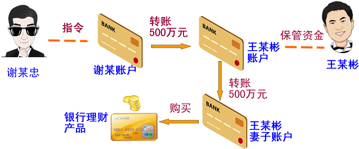 以購(gòu)買銀行理財(cái)產(chǎn)品掩飾犯罪資金。謝某忠為了掩飾犯罪所得,通過(guò)控制賬戶轉(zhuǎn)賬的方式把500萬(wàn)元轉(zhuǎn)賬到其侄女婿王某彬賬戶,隨后將該資金轉(zhuǎn)賬到王某彬妻子的銀行賬戶購(gòu)買理財(cái)產(chǎn)品。