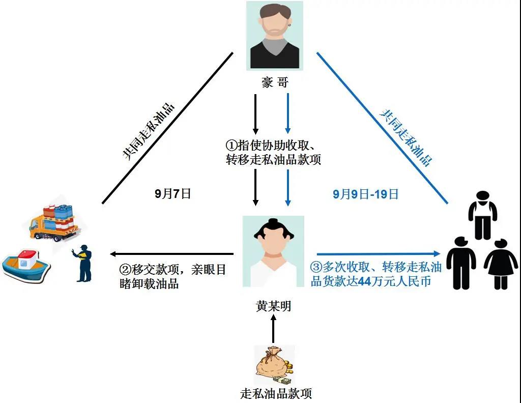 (一)提供個(gè)人銀行賬戶并協(xié)助提現(xiàn)或轉(zhuǎn)賬轉(zhuǎn)移資產(chǎn)。2020年9月7日晚,黃某明按照“豪哥”的指示,攜帶通過其名下銀行賬戶收到的款項(xiàng)前往斗門區(qū)某橋西側(cè)橋墩下,將款項(xiàng)交給??吭谠摰氐囊凰掖吧系娜藛T,并親眼目睹現(xiàn)場(chǎng)人員從上述船舶上卸載油品的情景,知悉“豪哥”等人在走私油品。同年9月9日至19日,黃某明協(xié)助“豪哥”等人多次收取、轉(zhuǎn)移走私油品貨款,共計(jì)人民幣439389元。