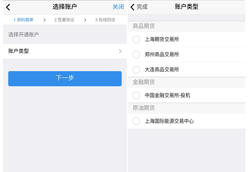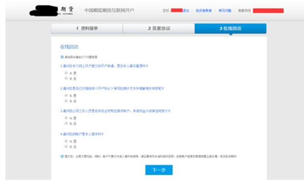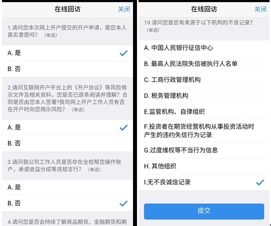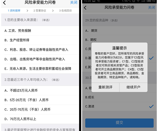 8、完成適當性試題。其中,C1類投資者中風險承受能力最低的客戶無法開戶,C1、C2類投資者且不屬于風險承受能力最低的客戶可在視頻后簽署相關協(xié)議開通賬戶,C3類投資者僅能開通商品期貨,C4和C5類投資者可開通原油和金融期貨