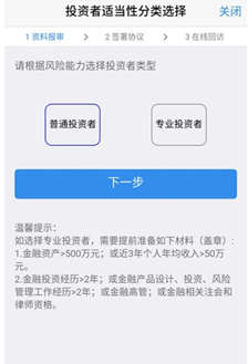7、投資者類型選擇,現(xiàn)階段我司線上僅支持普通投資者申請,專業(yè)投資者申請請走線下途徑。