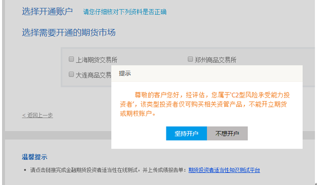 點擊“堅持開戶”,關閉提示,回到賬戶選擇頁面,點擊 “不想開戶”則退出到登錄頁面。互聯(lián)網(wǎng)開戶一次開戶和全市場首次開通金融帳戶和能源帳戶的客戶,選擇的期貨市場包括:上海期貨交易所、鄭州商品交易所、大連商品交易所。互聯(lián)網(wǎng)開戶二次開戶或 全市場已開金融帳戶和能源帳戶的客戶,可選擇的期貨市場:上海期貨交易所、鄭州商 品交易所、大連商品交易所、中國金融交易所,上海國際能源能源交易中心