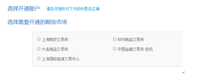 9、交易所選擇:客戶首次開戶只能選擇上海、大連和鄭州商品交易所。客戶若在其他公司開過金融期貨和原油期貨,上海、大連、鄭州,中國金融交易所和能源交易中心可以一起選擇。