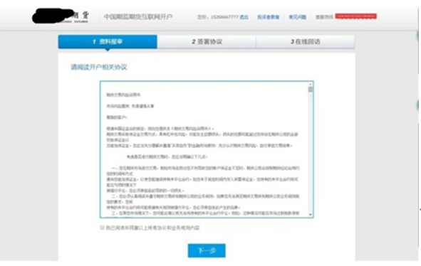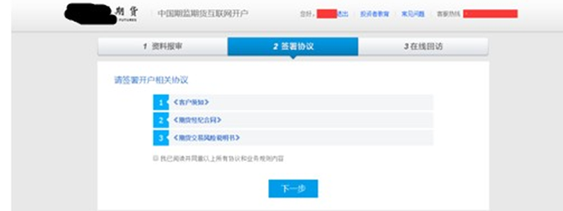 7、進入界面閱讀相關協(xié)議 ,相關協(xié)議為必讀項,閱讀完才可以點擊下一步,否則會提示“請拖動滾動條,閱讀完開戶相關協(xié)議”。