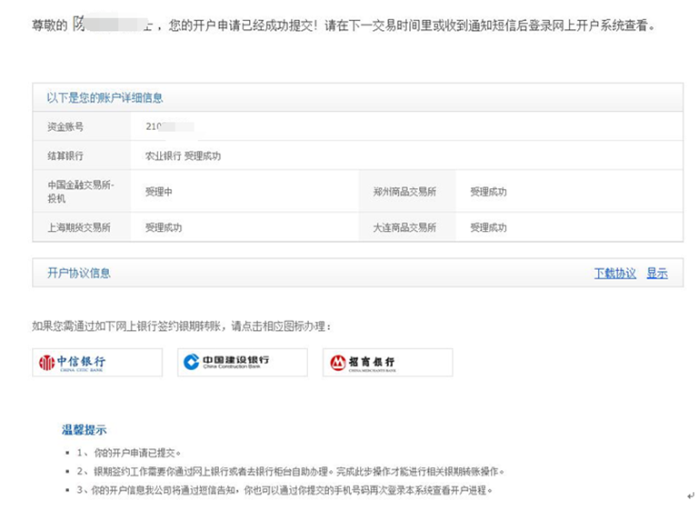 如開戶失敗,客戶會收到系統(tǒng)的短信通知,需重新登錄本系統(tǒng),修改完善以后再 提交開戶即可。