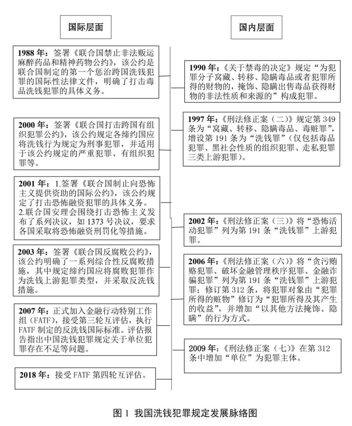 我國洗錢犯罪規(guī)定的演進完善呈現(xiàn)如下特點:一是與國際公約和標準要求基本同步,如為履行《聯(lián)合國禁止非法販運麻醉藥品和精神藥物公約》,于1990年將窩藏、清洗毒品犯罪所得規(guī)定犯罪,又如,為履行《聯(lián)合國制止向恐怖主義提供資助的國際公約》《聯(lián)合國反腐敗公約》,先后將“恐怖活動犯罪”“貪污賄賂犯罪”增列為第191條“洗錢罪”上游犯罪;二是“洗錢罪”上游犯罪范圍逐步擴大,由最初的三類犯罪,擴展為毒品犯罪、黑社會性質(zhì)的組織犯罪等七類犯罪;三是側(cè)重于通過局部修訂的方式進行完善,以贓物犯罪為基礎(chǔ)構(gòu)建洗錢犯罪規(guī)定,將第312條改造為“掩飾、隱瞞犯罪所得、犯罪所得收益罪”,同時適用于贓物犯罪和洗錢犯罪。(詳見圖1)