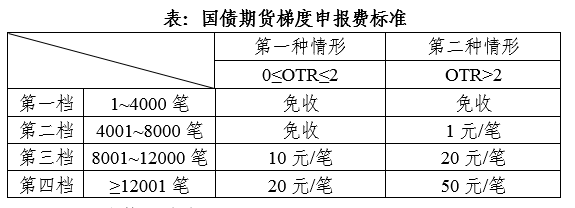 1.交易所對(duì)單日在國(guó)債期貨合約上信息量和OTR達(dá)到一定標(biāo)準(zhǔn)的非期貨公司會(huì)員、客戶收取梯度申報(bào)費(fèi)。信息量是指買入、賣出以及撤銷委托筆數(shù)的總和,報(bào)單和撤單各計(jì)為1筆。因即時(shí)全部成交或撤銷限價(jià)指令、即時(shí)成交剩余撤銷限價(jià)指令、市價(jià)指令產(chǎn)生的報(bào)單和撤單計(jì)入信息量統(tǒng)計(jì)。